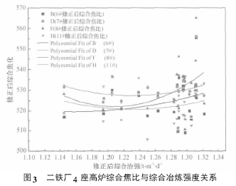 二鐵廠技術(shù)科通過對4 座高爐開爐以來數(shù)據(jù)分析發(fā)現(xiàn),在一定的冶煉條件下,合適的綜合冶煉強(qiáng)度對應(yīng)著較低的綜合焦比. 當(dāng)綜合冶煉強(qiáng)度偏移合適范圍時,綜合焦比都將相應(yīng)升高. 確定一個與最低綜合焦比相適應(yīng)的綜合冶煉強(qiáng)度不僅能夠降低焦比而且這種不盲目追求冶煉強(qiáng)度的生產(chǎn)方式有利于高爐順行和產(chǎn)量的穩(wěn)步提高. 為了不受其他因素影響,將綜合焦比進(jìn)行了同口徑化校正: 入爐綜合品位每變化1%,綜合焦比變化6 kg /t; 熟料率變化1%,綜合焦比變化1. 2 kg /t; 風(fēng)溫變化100 ℃影響15 kg /t 綜合焦比,校正后的綜合焦比與綜合冶煉強(qiáng)度關(guān)系如圖3 所示. 可以看到4 座高爐都有一個合適的綜合冶煉強(qiáng)度范圍對應(yīng)著較低綜合焦比水平. 2015 年4 座高爐通過控制綜合冶煉強(qiáng)度在該范圍內(nèi),獲得了更佳的綜合焦比,進(jìn)一步節(jié)約了煉鐵能耗.