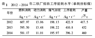 通過以上一系列措施,2014 年二鐵廠節(jié)能降耗水平大幅度提高. 2012 年至2014 年二鐵廠節(jié)能降耗效果如表1 所示,生鐵產(chǎn)量從2012 年的417. 5 萬t 增加到2014 年的460 萬t,煉鐵工序能耗由2012年的422. 9 kg 標(biāo)煤/t 降低到2014 年的396. 21 kg標(biāo)煤/t. 燃料單耗由607. 97 kg 標(biāo)煤/t 下降到581. 17 kg 標(biāo)煤/t; 動力單耗由13. 06 kg 標(biāo)煤/t 降至11. 01 kg 標(biāo)煤/t; 煤氣回收基本保持不變.