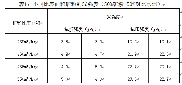 2)  當?shù)V粉的比表面積≥450m²/kg時,其活性已得到較充分的發(fā)揮,隨著比表面積的繼續(xù),其活性指數(shù)幾乎相同,且能耗升高,不是理想的技術(shù)指標。