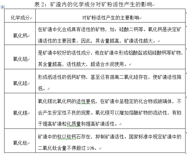 高爐礦渣的化學成分一般為CaO、SiO2、Al2O3、MgO,和少量的TiO2,這些金屬氧化物含量的多少直接影響著礦粉活性指數(shù)。