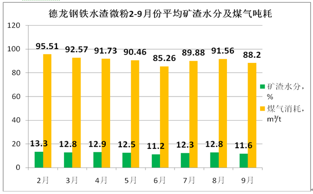 入磨礦渣水分波動直接影響加熱爐煤氣耗量,水分過大(≥13%),需要提高磨機入口溫度(即加熱爐出口溫度),使磨機主電機和選粉機電流升高,磨內(nèi)壓差增大,外循環(huán)料量加大,加大磨機磨損和能耗。水分偏低(<9%)不利于磨內(nèi)形成穩(wěn)定的料層,磨機振動值偏高。