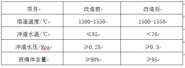 我們通過對高爐沖渣系統(tǒng)進行改造,主要提高沖渣水壓,降低沖渣水溫,在高爐熔渣溫度渣流大小不變的情況下,使熔渣急速冷卻,提高了?;V渣的玻璃體含量,從而提高礦渣的潛在活性。(沖渣系統(tǒng)改造效果見下表)