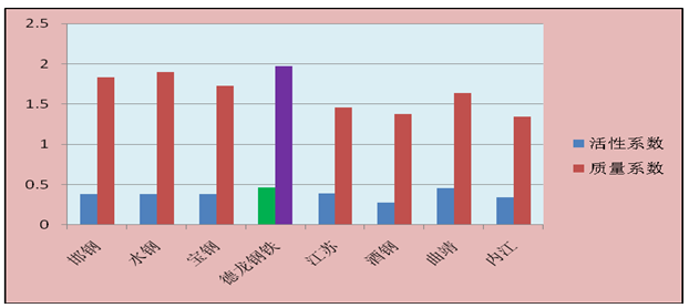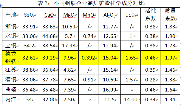 可以看出,經(jīng)過優(yōu)化配用后,德龍鋼鐵礦渣的活性指數(shù)和質(zhì)量系數(shù)均高于邯鋼和水鋼生產(chǎn)的高活性堿性礦渣,為生產(chǎn)出高活性的礦渣微粉奠定了堅實的基礎(chǔ)。