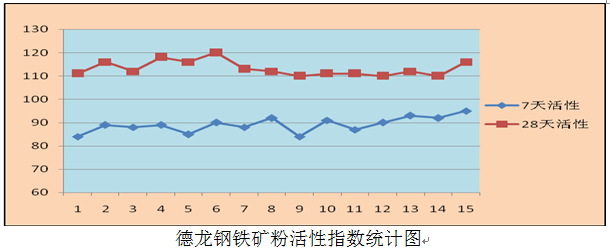 由上圖看出,在穩(wěn)定礦粉化學成分組成,有效控制活性礦物CaO含量39-40%,Al2O3含量13%左右,減少惰性礦物SiO2含量≤31%,使礦粉的活性指數(shù)達到了7天≥84%、28天≥110%,分別高出GB/T18046-2008關(guān)于S95級礦粉技術(shù)指標要求的7天(≥75%)和28天(≥95%)活性指數(shù)9個百分點和15個百分點,尤其是28天的活性指數(shù),已達到了S105級的28天活性要求(≥105%)。