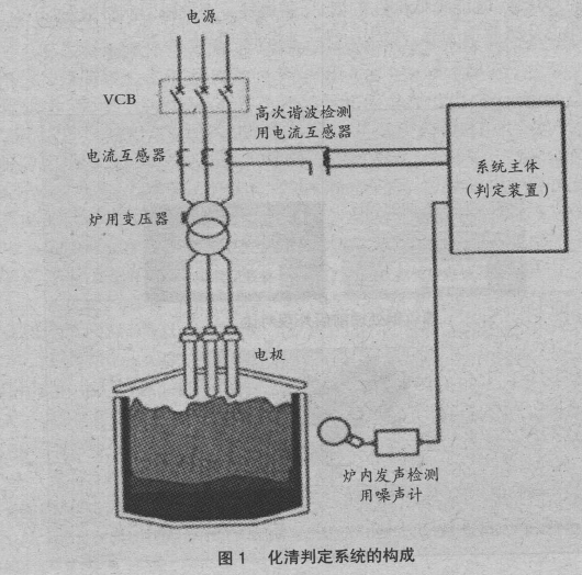 此背景下,日本大同特鋼公司開發(fā)了電爐自動判定廢鋼熔化的E-a djust 系統(tǒng)(如圖1)。主要利用電爐冶煉過程中發(fā)生的高次諧波電流(或高次諧波電壓)和電爐發(fā)聲兩個要素判定爐內(nèi)廢鋼熔化狀態(tài),進(jìn)而進(jìn)行自動化控制。