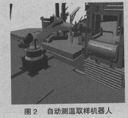 普遍使用的取樣和測溫方式是通過人工將取樣器或熱電偶從爐門插入鋼水中來完成的。西門子奧鋼聯(lián)公司設(shè)計(jì)的Simetal LiquiRob 自動測溫取樣機(jī)器人(如圖2),外層涂有特殊防塵隔熱纖維,具有6 個自由度的運(yùn)動、自動更換取樣器和測溫探頭、檢測無效測溫探頭等功能,可以通過人機(jī)界面全自動控制。與機(jī)械手取樣相比,使用壽命更長,維修成本更低。自動取樣測溫機(jī)器人的使用改善工作環(huán)境,提高了測溫取樣的精度。
