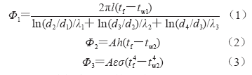 式中:Φ1 為通過包殼導熱的熱流通量,W/m2;Φ2 為通過包壁對流的熱流通量,W/m2;Φ3 為通過包壁輻射的熱流通量,W/m2;λ1、λ2、λ3 為鐵水包工作層、永久層和包殼的導熱系數(shù),W/ (m2·K);d1、d2、d3、d4為鐵水包工作層內(nèi)徑、永久層內(nèi)徑、包殼內(nèi)徑和包殼外徑,m;A 為鐵水包內(nèi)壁表面積,m2;tf 為包襯工作層溫度,℃;tw1 為包殼溫度,℃;tw2 為空氣溫度,℃;ε 為包壁工作層的發(fā)射率;h 為表面?zhèn)鳠嵯禂?shù),W/ (m2 ·K);σ 為Stefan-Boltzmann 常數(shù),5.67×10-8 W/ (m2·K)。