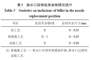 本廠以前在連鑄換水口使用普通保護(hù)渣未用油時(shí),鑄坯曾出現(xiàn)過大顆粒夾雜異常和鑄坯表面夾渣缺陷嚴(yán)重的情況,因此本次試驗(yàn)也驗(yàn)證了換水口段鑄坯的低倍和金相夾雜情況。使用試驗(yàn)專用渣的換水口段鑄坯低倍夾雜物評(píng)級(jí)為0 級(jí),未發(fā)現(xiàn)大顆粒夾雜物;鑄坯金相檢驗(yàn)也未出現(xiàn)大顆粒夾雜物異常的情況,見表3。這表明試驗(yàn)專用渣具有較好的熔化特性,能避免來不及熔化的保護(hù)渣卷入鋼液形成鑄坯內(nèi)的大顆粒夾雜物。