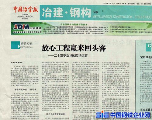 中國鋼鐵企業(yè)網(wǎng)二十冶訊(記者王升堂/文圖)8月23日,最新一期《中國冶金報》在冶建鋼構(gòu)專版頭條以《放心工程贏來回頭客》為題刊發(fā)了中國二十冶集團以現(xiàn)場拓市場的紀實報道。