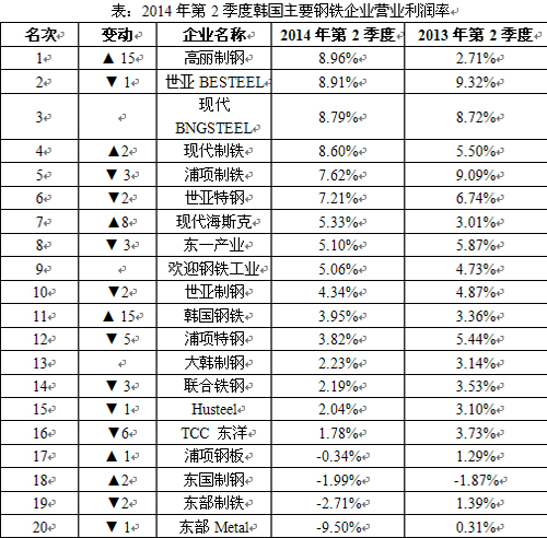 核心提示:據(jù)韓國網(wǎng)站EBN本月2日的消息稱,韓國金融監(jiān)督院公布了韓國國內(nèi)20家鋼鐵企業(yè)今年第2季度經(jīng)營業(yè)績,高麗制鋼以8.96%的營業(yè)利潤率位