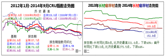 9月份的全球鋼市在亞洲,主要是中國大陸鋼價深度下跌的拖累下,繼續(xù)呈現(xiàn)東弱西強的格局。月末,157.7點的CRU總指數(shù)月環(huán)比下跌2.0%(跌幅擴大)。其中:亞洲指數(shù)151.1點,月環(huán)比下跌4.5%(跌幅擴大);歐洲指數(shù)153.3點,月環(huán)比上漲1.2%(漲幅擴大);北美指數(shù)179.6%,月環(huán)比下跌0.5%(由平轉(zhuǎn)跌);扁平材指數(shù)152.9點,月環(huán)比下跌1.7%(跌幅擴大);長材指數(shù)169.6點,月環(huán)比下跌2.4%(跌幅擴大)。CRU運行態(tài)勢顯示:全球鋼市中,美洲鋼市走勢最強,指數(shù)遠高于其它市場;歐洲鋼市次之,三季度以來走強跡象明顯;亞洲鋼市受權(quán)重最大的中國大陸市場拖累,大幅下拉了CRU總指數(shù)的下滑。為此,結(jié)合基本面情況預測,近期全球鋼市將繼續(xù)東弱西強的分化走勢,直至中國大陸市場出現(xiàn)觸底反彈為止。(見下圖一、圖二)