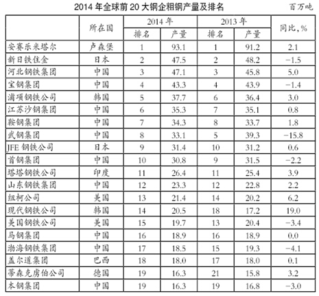 2014年美國鋼鐵公司粗鋼產量為1970萬噸,同比下滑3.4%,排名也由上年的第13位降至第15位。美國紐柯公司排名則上升一位至第13位,粗鋼產量同比增長6.2%至2140萬噸;韓國現代鋼鐵公司由于新高爐投產,粗鋼產量大幅攀升19%,達到2050萬噸,排名更是從上年的第18位上升至第14位,是排名前20位鋼企中上升幅度最大的。