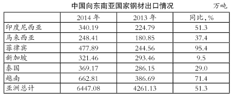 2014年中國(guó)鋼材出口出現(xiàn)大幅增長(zhǎng),累計(jì)出口鋼材9378萬噸,較2013年的6233萬噸增長(zhǎng)50.5%,其中向亞洲國(guó)家出口鋼材6447萬噸,同比增長(zhǎng)51.3%,這也使得該地區(qū)成為中國(guó)最大的鋼材出口目的地,占中國(guó)鋼材出口總量的68.7%。