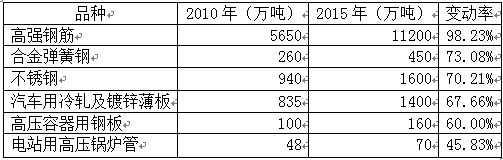《鋼鐵工業(yè)“十二五”發(fā)展規(guī)劃》公布2011~2015年期間,2015年關(guān)鍵鋼材品種消費(fèi)預(yù)測值,其中,高強(qiáng)鋼筋等鋼材品種消費(fèi)量增幅較大(見下表)。