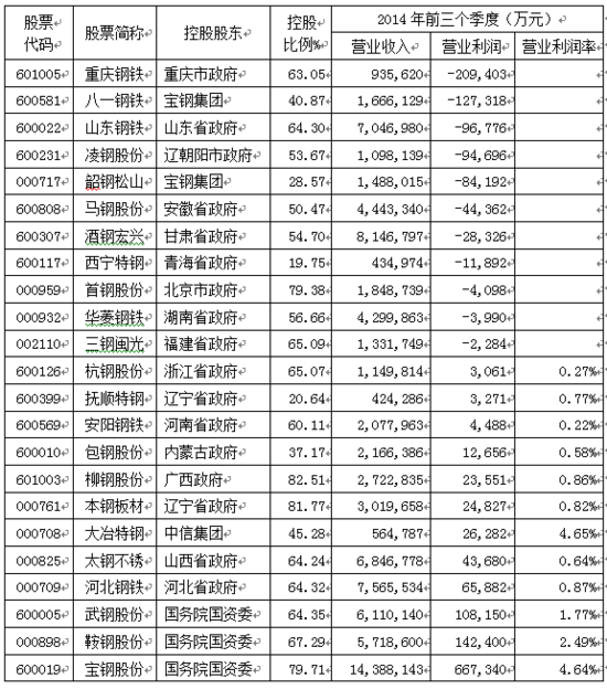 我國鋼鐵行業(yè)上市公司整體經(jīng)營狀況不佳。23家由各級(jí)地方政府國資委控股的鋼鐵行業(yè)上市公司中,截至2014年前三個(gè)季度,有11家虧損;在12家盈利上市公司中,有8家上市公司的營業(yè)利潤率不足1%。(見下表)