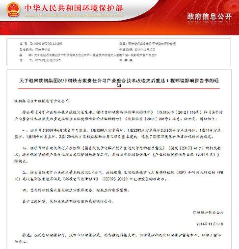 上述文章所寫的陜鋼集團漢鋼公司全稱為“陜鋼集團漢中鋼鐵有限責(zé)任公司”。據(jù)新華網(wǎng)記者了解,未經(jīng)環(huán)保部許可,2009年6月28日,總投資137.04億元的陜鋼集團漢鋼公司產(chǎn)業(yè)整合技術(shù)改造災(zāi)后重建項目便擅自開工,并正式投產(chǎn)數(shù)年。