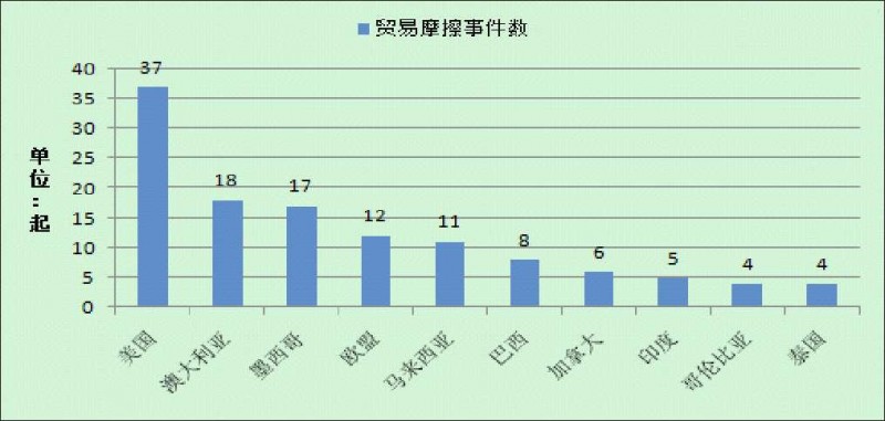 2014年~2015年上半年,針對(duì)我國(guó)鋼鐵行業(yè)發(fā)起貿(mào)易摩擦事件的國(guó)家和地區(qū)中,除了美國(guó)、歐盟外,還有大洋洲的澳大利亞、北美洲的墨西哥和加拿大、南美洲的巴西和哥倫比亞,以及亞洲的馬來(lái)西亞、印度和泰國(guó)等國(guó)(如圖所示)。另外,土耳其、危地馬拉和印尼等國(guó)在這一期間同樣對(duì)我國(guó)鋼鐵產(chǎn)品發(fā)起反傾銷(xiāo)調(diào)查。其中,美國(guó)針對(duì)我國(guó)鋼鐵產(chǎn)品發(fā)起的貿(mào)易摩擦事件最多,為37起,而歐盟發(fā)起的反傾銷(xiāo)調(diào)查最多,為7起。這也說(shuō)明歐美針對(duì)我國(guó)鋼鐵行業(yè)實(shí)施的貿(mào)易保護(hù)措施最為頻繁。