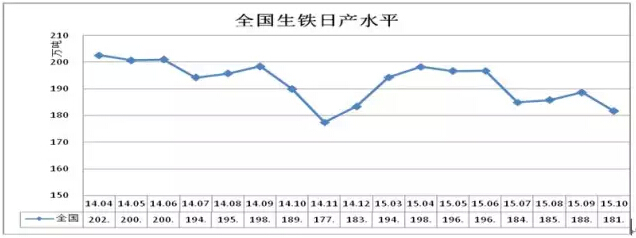 10月份,生鐵日產水平為181.65萬噸/日,比去年同期減少8.3萬噸/日、下降4.37%,比上月減少7萬噸/日、下降3.71%;1-10月生鐵累計日產水平為192.34萬噸/日,比去年同期減少6.57萬噸/日、下降3.3%。