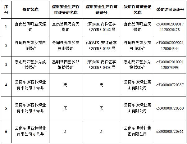 此次公告淘汰的6對(duì)礦井中,宜良縣鳳鳴露天煤礦、尋甸縣先鋒鄉(xiāng)賈白山煤礦和嵩明縣四營(yíng)鄉(xiāng)姑娘橋煤礦3對(duì)礦井具有煤礦安全生產(chǎn)許可證和采礦許可證。云南東源石林煤業(yè)有限公司2號(hào)井、云南東源石林煤業(yè)有限公司5號(hào)井和云南東源石林煤業(yè)有限公司6號(hào)井,只有采礦許可證,無(wú)煤礦安全生產(chǎn)許可證。