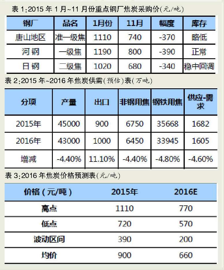 2015年,焦炭行業(yè)產(chǎn)能退出仍難緩解過(guò)剩困局,焦炭?jī)r(jià)格持續(xù)單邊下行,獨(dú)立焦化企業(yè)虧損加劇。預(yù)計(jì)2016年供需矛盾仍將制約焦炭市場(chǎng)運(yùn)行和行業(yè)發(fā)展,焦炭市場(chǎng)弱勢(shì)難改,焦炭?jī)r(jià)格波動(dòng)區(qū)間約200元/噸,部分獨(dú)立焦化廠將停產(chǎn)倒閉。