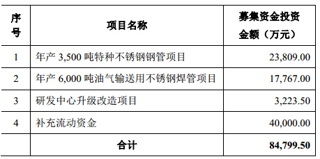 3月11日,江蘇武進(jìn)不銹股份有限公司(下稱“武進(jìn)不銹”)發(fā)布招股說(shuō)明書(shū),公司擬募集資金8.48億元,分別用于年產(chǎn)3500噸的特種不銹鋼鋼管項(xiàng)目、年產(chǎn)6000噸的油氣輸送用不銹鋼焊管項(xiàng)目、研發(fā)中心升級(jí)改造項(xiàng)目以及補(bǔ)充流動(dòng)資金。