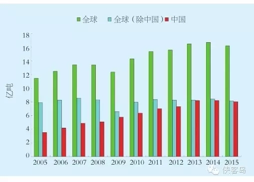 2005-2015年全球、全球(除中國(guó))及中國(guó)粗鋼產(chǎn)量