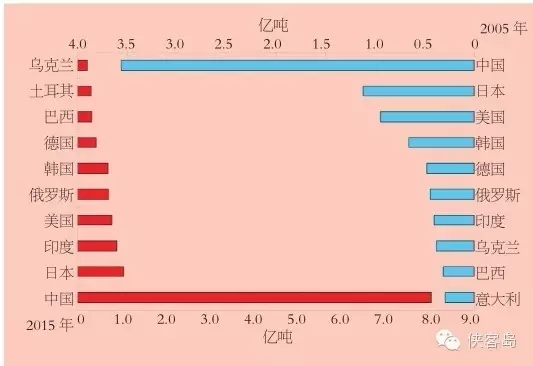 2005年和2015年全球前十大粗鋼生產(chǎn)國(guó)