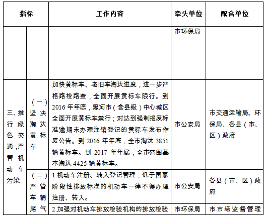 1.堅決淘汰黃標車。市公安局會同市交通運輸局、市環(huán)保局負責(zé)加快黃標車、老舊車淘汰進度,進一步嚴格路檢路查,全面開展黃標車限行。到2016年年底,全市(含縣級)中心城區(qū)全面開展黃標車禁行,進一步擴大黑河市建成區(qū)黃標車限行路段,對限行區(qū)域內(nèi)違規(guī)通行的黃標車進行處罰;對達到強制報廢標準逾期未辦理注銷登記的黃標車發(fā)布作廢公告。到2016年年底,全市淘汰3851輛黃標車。到2017年年底,全市范圍基本淘汰剩余4425輛黃標車。