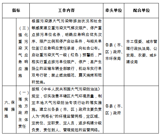 3.強化重污染天氣應(yīng)急響應(yīng)措施。各地、各有關(guān)單位要根據(jù)污染源大氣污染物排放狀況和社會敏感度建立重污染天氣梯次限產(chǎn)、停產(chǎn)重點排污單位名錄,明確應(yīng)急響應(yīng)優(yōu)先次序、限產(chǎn)比例和停產(chǎn)啟動條件,與相關(guān)單位簽訂應(yīng)急響應(yīng)責(zé)任承諾,向社會公布。啟動重污染天氣一級(紅色)預(yù)警后,嚴格實行重點排污單位限產(chǎn)、停產(chǎn);易產(chǎn)生揚塵的運輸車輛全部禁行,機動車實行單雙號行駛;禁止燃放煙花、露天燒烤和秸稈焚燒。四、保障措施