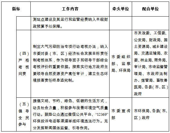 (一)落實地方政府主體責(zé)任。各地要按照《中華人民共和國大氣污染防治法》規(guī)定,切實改善本轄區(qū)大氣環(huán)境質(zhì)量,制定本地大氣污染防治專項行動的落實措施。建立以各地政府主要負責(zé)人為“網(wǎng)格長”的環(huán)境監(jiān)管網(wǎng)格,定區(qū)域、定崗位、定職責(zé)、定人員,逐步構(gòu)建分級負責(zé)、責(zé)任到人、管理規(guī)范的監(jiān)管網(wǎng)絡(luò)。各地要于2016年4月底前完成網(wǎng)格劃分和任務(wù)分解工作,每年12月底前向市政府報告大氣污染防治行動計劃和專項行動開展情況。