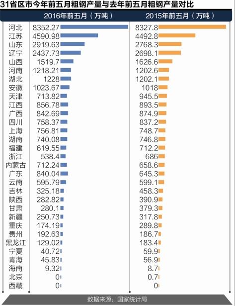 21世紀經(jīng)濟報道查詢國家統(tǒng)計局的數(shù)據(jù)發(fā)現(xiàn),1-5月全國鋼鐵產(chǎn)量前幾名,河北、江蘇、山東粗鋼產(chǎn)量分別為8352.27萬噸、4590.98萬噸、2919.63萬噸。這一數(shù)據(jù)顯示,河北、江蘇、山東的粗鋼產(chǎn)量比上一年同期分別增產(chǎn)了0.3%、2.19%、5.47%,高于去年同期的8327.8萬噸、4492.8萬噸、2768.3萬噸。