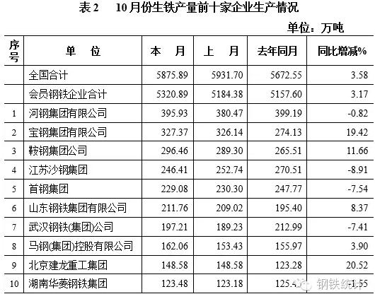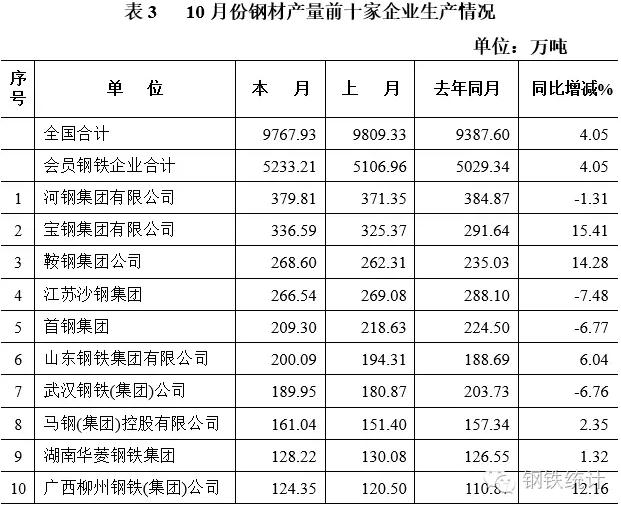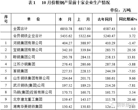 10月份,會員統(tǒng)計企業(yè)中,河北鋼鐵集團等企業(yè)產(chǎn)量居前。排名居前的十家企業(yè)共生產(chǎn)粗鋼2386.67萬噸、生鐵2338.34萬噸、鋼材2264.49萬噸,分別占會員統(tǒng)計鋼鐵企業(yè)生產(chǎn)總量的43.91%、43.95%、43.27%,占全鋼鐵生產(chǎn)總量的34.8%、39.80%、23.18%。