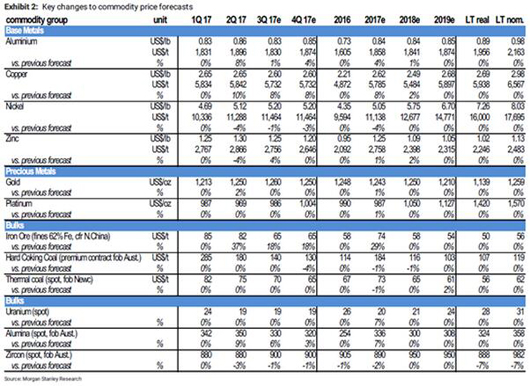 摩根士丹利上調(diào)了一批金屬商品的價格預(yù)期。 將第二季度鐵礦石價格預(yù)期上調(diào)37%至82美元/噸, 2017年鐵礦石價格預(yù)期上調(diào)29%至74美元/噸。