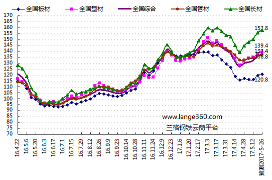 2017年第20周(2017.5.15-5.19)蘭格鋼鐵全國(guó)鋼材綜合價(jià)格指數(shù)達(dá)到136.0點(diǎn),較上周上升2.98%,較去年同期上升32.92%。其中,LGMI長(zhǎng)材價(jià)格指數(shù)為155.8點(diǎn),較上周上升3.63%,較去年同期上升48.19%;LGMI型材價(jià)格指數(shù)為138.2點(diǎn),較上周上升2.40%,較去年同期上升35.30%;LGMI板材價(jià)格指數(shù)為119.6點(diǎn),較上周上升2.72%,較去年同期上升19.41%;LGMI管材價(jià)格指數(shù)為136.0點(diǎn),較上周上升1.39%,較去年同期上升33.42%。