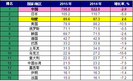 3 2015年世界Top 15國家/地區(qū)粗鋼產(chǎn)量統(tǒng)計(jì)(單位:百萬噸)