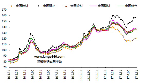 5月份,在取締地條鋼、環(huán)保督查力度加大的影響下,以及需求有所釋放的拉動下, 國內(nèi)鋼鐵市場呈現(xiàn)震蕩反彈局面。據(jù)蘭格鋼鐵云商平臺監(jiān)測數(shù)據(jù)顯示,截至5月31日,蘭格鋼鐵全國鋼材綜合價(jià)格指數(shù)為137.7,較上月末上升5.6%,年同比上升43.1%。其中,建材價(jià)格指數(shù)為157.6,較上月末上升8.1%,年同比上升62.1%;板材價(jià)格指數(shù)為121.3,較上月末上升3.3%,年同比上升27.3%;型材價(jià)格指數(shù)為139.7,較上月末上升5.8%,年同比上升43.6%;管材價(jià)格指數(shù)為137.7,較上月末上升3.8%,年同比上升42.0%(詳見圖1)。
