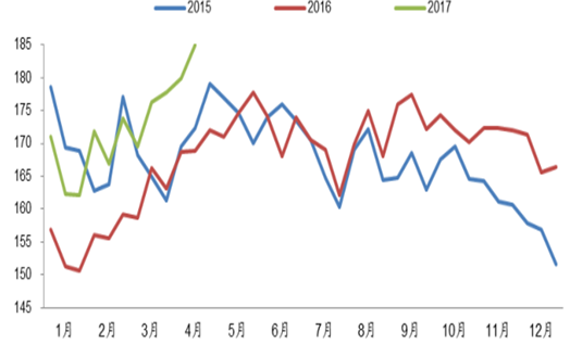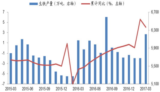年初房地產(chǎn)市場回暖,粗鋼及生鐵產(chǎn)量同比上升。17 年 1-3 月粗鋼產(chǎn)量 2 億噸,同比+4.7%;生鐵產(chǎn)量 1.8 億噸,同比+5.7%。二季度鋼鐵將迎來旺季、需求進(jìn)一步加大。