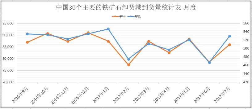 圖8 中國30個(gè)主要鐵礦石卸貨港到崗量統(tǒng)計(jì)表(月度)