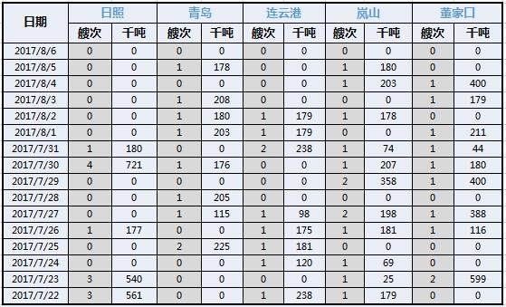 結(jié)合7月底的軍演,通過對(duì)以上港口鐵礦石到港量數(shù)據(jù)分析,可以看到,軍演期間鐵礦石到港船的數(shù)量減少。其中日照、連云港在7月27日到29日,船舶到港量記錄為0,軍演結(jié)束后日照港船舶到港量30日迅速回升到4,8月5日到6日的軍演,該兩港鐵礦石到港船舶數(shù)量也是0。