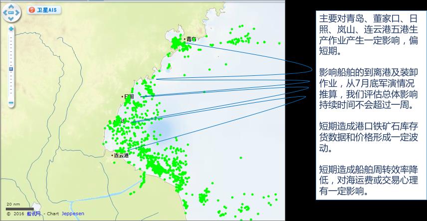 此次軍演對(duì)鐵礦石的影響,主要體現(xiàn)在對(duì)鐵礦石運(yùn)輸船舶作業(yè)的影響。受影響最大的包括青島、董家口、日照、嵐山、連云港這5大鐵礦石中轉(zhuǎn)港。從影響時(shí)間上看,偏短期。從7月底軍演情況推算,我們?cè)u(píng)估總體影響持續(xù)時(shí)間不會(huì)超過一周。由于影響船舶的到離港及裝卸作業(yè),短期對(duì)港口鐵礦石庫存貨數(shù)據(jù)和價(jià)格形成一定波動(dòng)。另外,由于造成船舶周轉(zhuǎn)效率降低,對(duì)海運(yùn)費(fèi)或交易心理有一定影響,不排除因此短期會(huì)推升海運(yùn)費(fèi)。