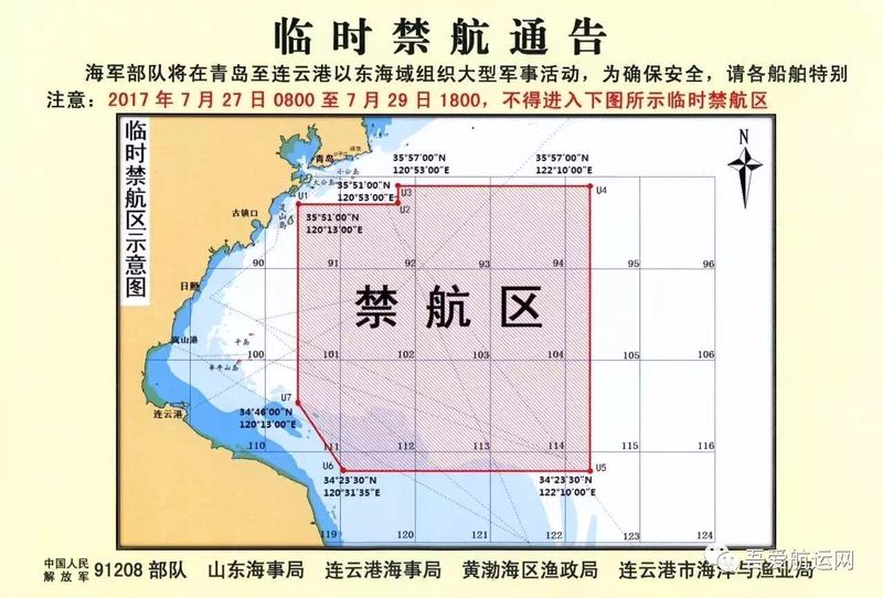 圖1 7月27日8時(shí)至29日18時(shí)黃海禁航區(qū)域