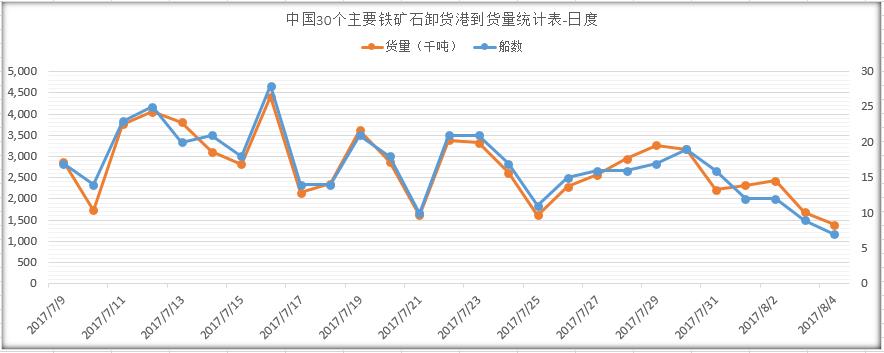 圖6 中國30個(gè)主要鐵礦石卸貨港到崗量統(tǒng)計(jì)表(日度)