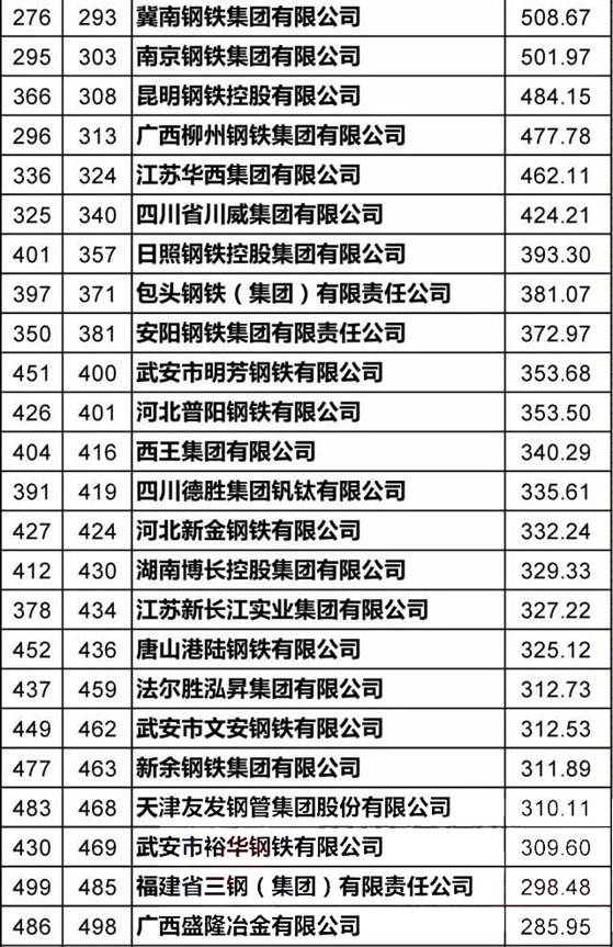 但與去年相比,上榜的鋼鐵企業(yè)數(shù)量有所減少,2016年上榜的青島鋼鐵控股集團(tuán)有限責(zé)任公司(現(xiàn)青島特鋼)、凌源鋼鐵集團(tuán)有限責(zé)任公司、山東泰山鋼鐵集團(tuán)有限公司,2017年未再上榜。