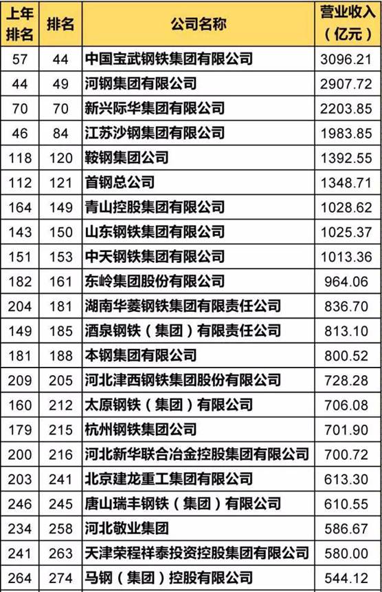 鋼鐵行業(yè)中,營業(yè)收入超過千億的企業(yè)還有江蘇沙鋼集團(tuán)有限公司(84)、鞍鋼集團(tuán)公司(120)、首鋼總公司(現(xiàn)改名為“首鋼集團(tuán)”,第121)、青山控股集團(tuán)有限公司(149)、山東鋼鐵集團(tuán)有限公司(150)、中天鋼鐵集團(tuán)有限公司(153)等。鋼鐵企業(yè)群體整體扭虧,情況好轉(zhuǎn)。