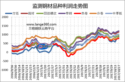 分品種來看,10月份各品種平均毛利依次如下:帶鋼盈利1156元,線材盈利1098元,中厚板盈利974元,三級螺紋鋼盈利901元,冷軋卷板盈利793元,熱軋卷板盈利760元,方坯盈利731元;10月份除中厚板盈利增加51元外,其他品種盈利均下降,其中,三級螺紋鋼盈利降幅最大,為75元;熱軋卷板盈利降幅最小,為9元;其他品種盈利降幅在10-53元之間。