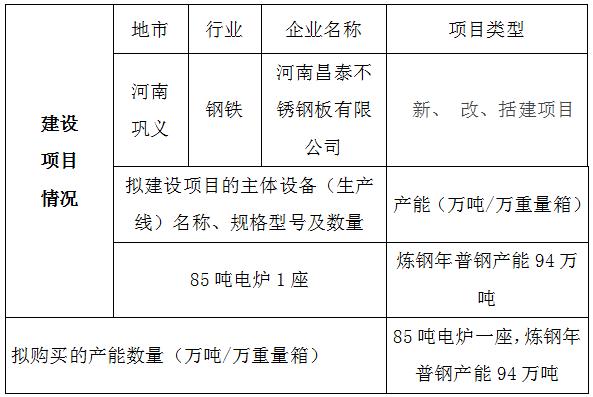 按照《河南省工業(yè)和信息化委員會(huì)關(guān)于印發(fā)河南省部分產(chǎn)能嚴(yán)重過剩行業(yè)產(chǎn)能置換實(shí)施辦法的通知》(工信部產(chǎn)業(yè)〔2015〕150號(hào))要求,河南昌泰不銹鋼板有限公司1×530m3煉鐵高爐(2號(hào))項(xiàng)目產(chǎn)能62萬(wàn)噸、1×60噸轉(zhuǎn)爐項(xiàng)目煉鋼產(chǎn)能95萬(wàn)噸產(chǎn)能出讓和85噸電爐1座普鋼產(chǎn)能94萬(wàn)噸產(chǎn)能需求擬在全國(guó)范圍內(nèi)發(fā)布置換產(chǎn)能指標(biāo),現(xiàn)將河南昌泰不銹鋼板有限公司產(chǎn)能置換指標(biāo)出讓信息(見附表)予以公告。