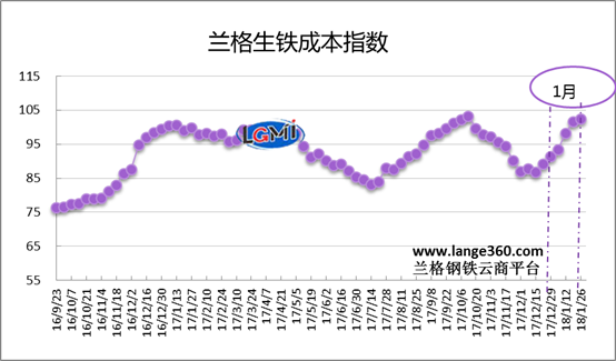 從圖1蘭格生鐵成本指數(shù)走勢(shì)圖可以看出,2018年1月份的生鐵成本指數(shù)呈持續(xù)上升走勢(shì),由月初的93.3點(diǎn)上升至月末為102.4點(diǎn),均值較上月上升11.9%。