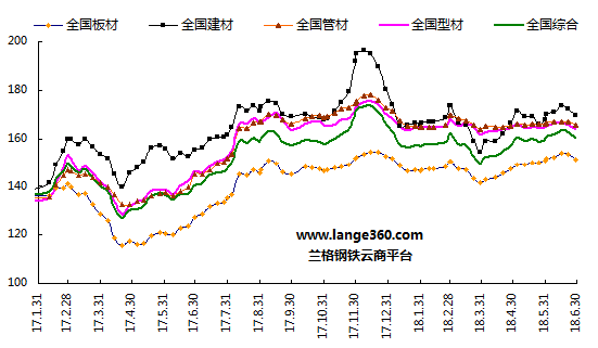 2018年6月份,國(guó)內(nèi)鋼鐵市場(chǎng)呈現(xiàn)先揚(yáng)后抑、小幅上行的趨勢(shì),其中建材、板材小幅上行,型材、管材小幅回落。據(jù)蘭格鋼鐵云商平臺(tái)監(jiān)測(cè)數(shù)據(jù)顯示,截至6月29日,蘭格鋼鐵全國(guó)鋼材綜合價(jià)格指數(shù)為160.3,較上月末上升1.0%,年同比上升14.3%。其中,建材價(jià)格指數(shù)為169.5,較上月末上升1.7%,年同比上升9.6%;板材價(jià)格指數(shù)為151.2,較上月末上升0.7%,年同比上升19.2%;型材價(jià)格指數(shù)為164.0,較上月末下降0.3%,年同比上升12.8%;管材價(jià)格指數(shù)為165.7,較上月末下降0.2%,年同比上升14.7%(詳見圖1)。