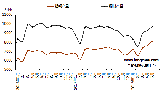 1、5月份粗鋼產(chǎn)量繼續(xù)攀升   日產(chǎn)超越上月再創(chuàng)新高