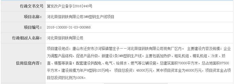 河北榮信鋼鐵有限公司3個型鋼項目獲備案